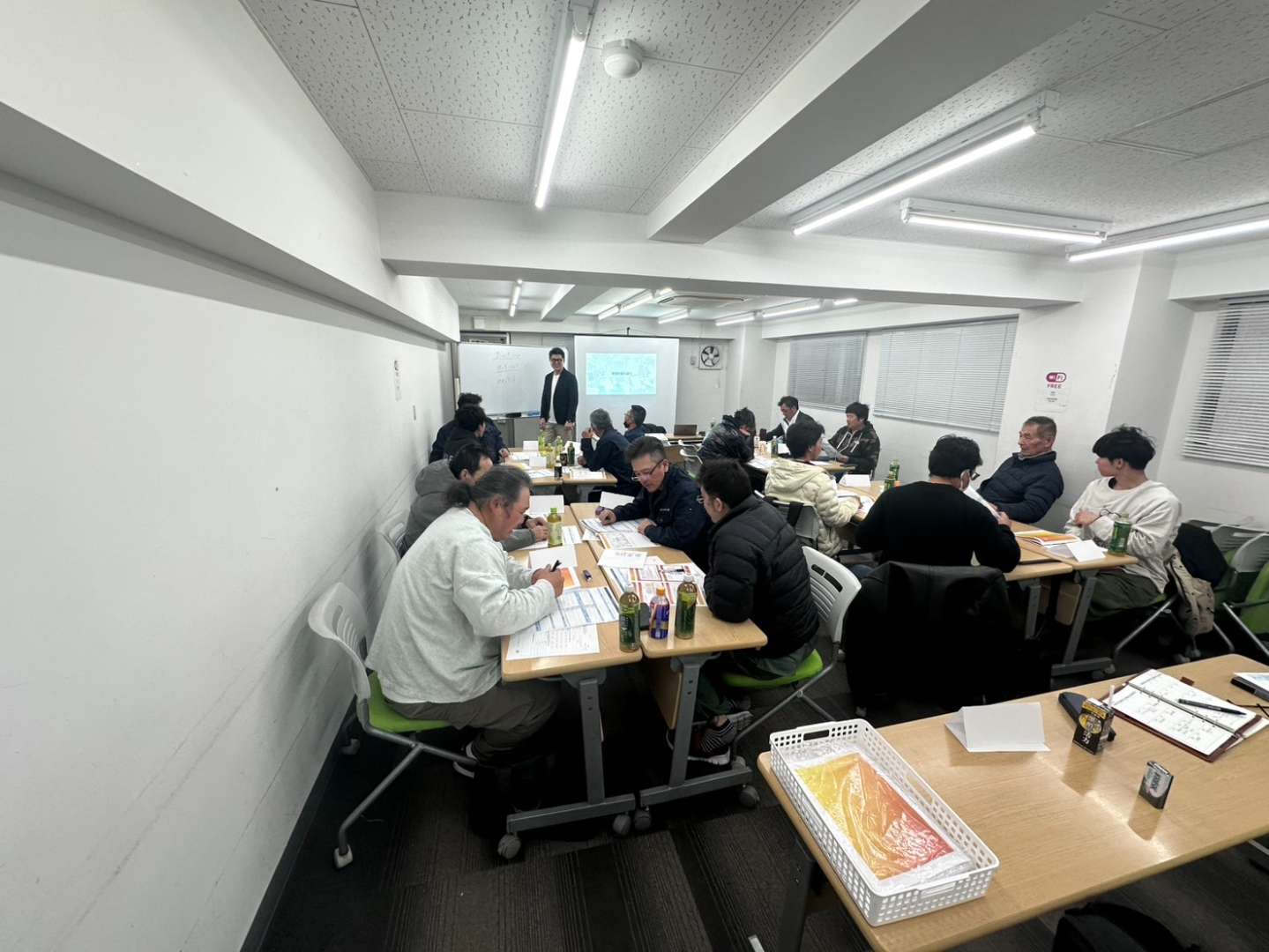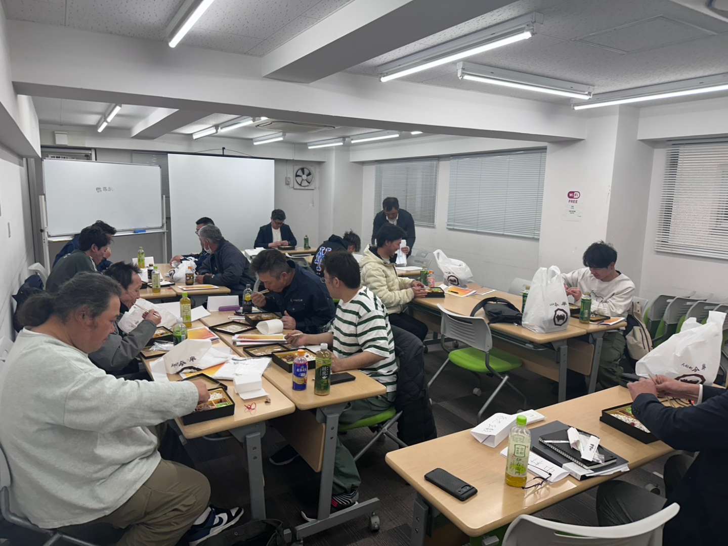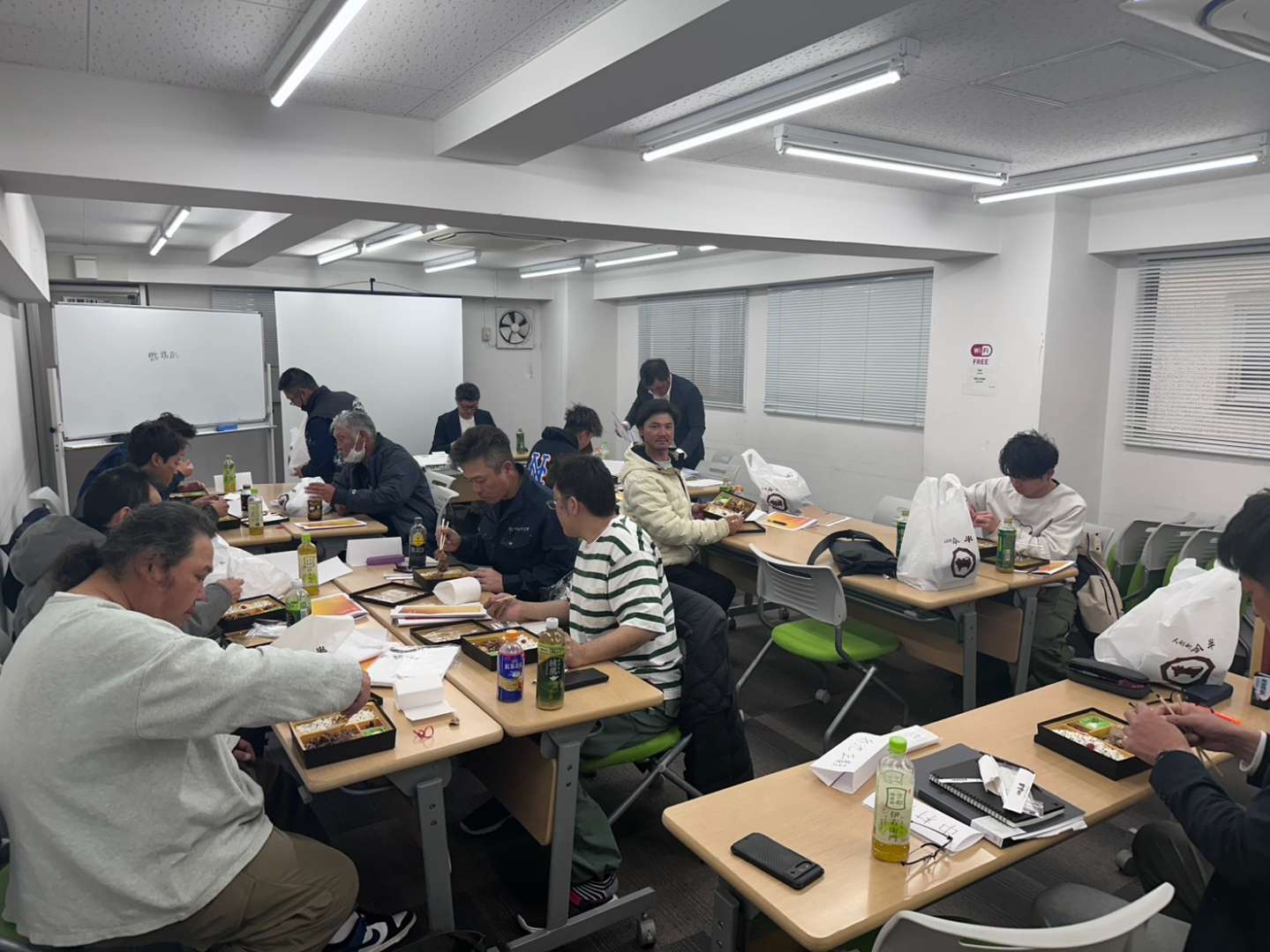 講義中は真剣そのものですが、お昼休憩はみんなでお弁当を囲んで和気あいあい。メリハリをつけて学べる、アカイケ工業らしいアットホームな研修となりました。